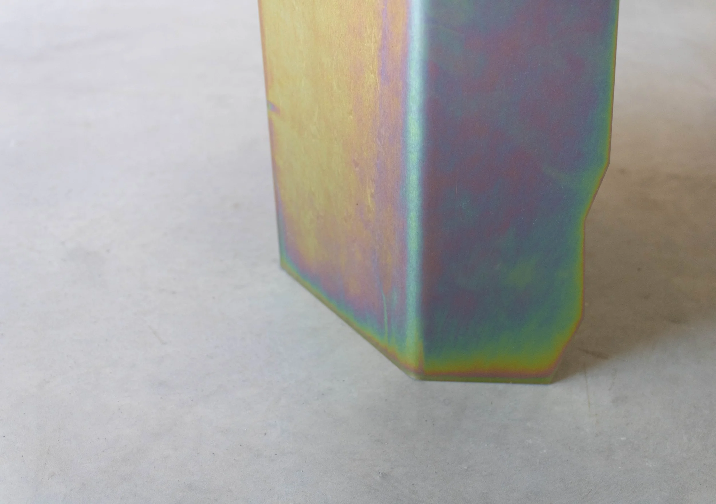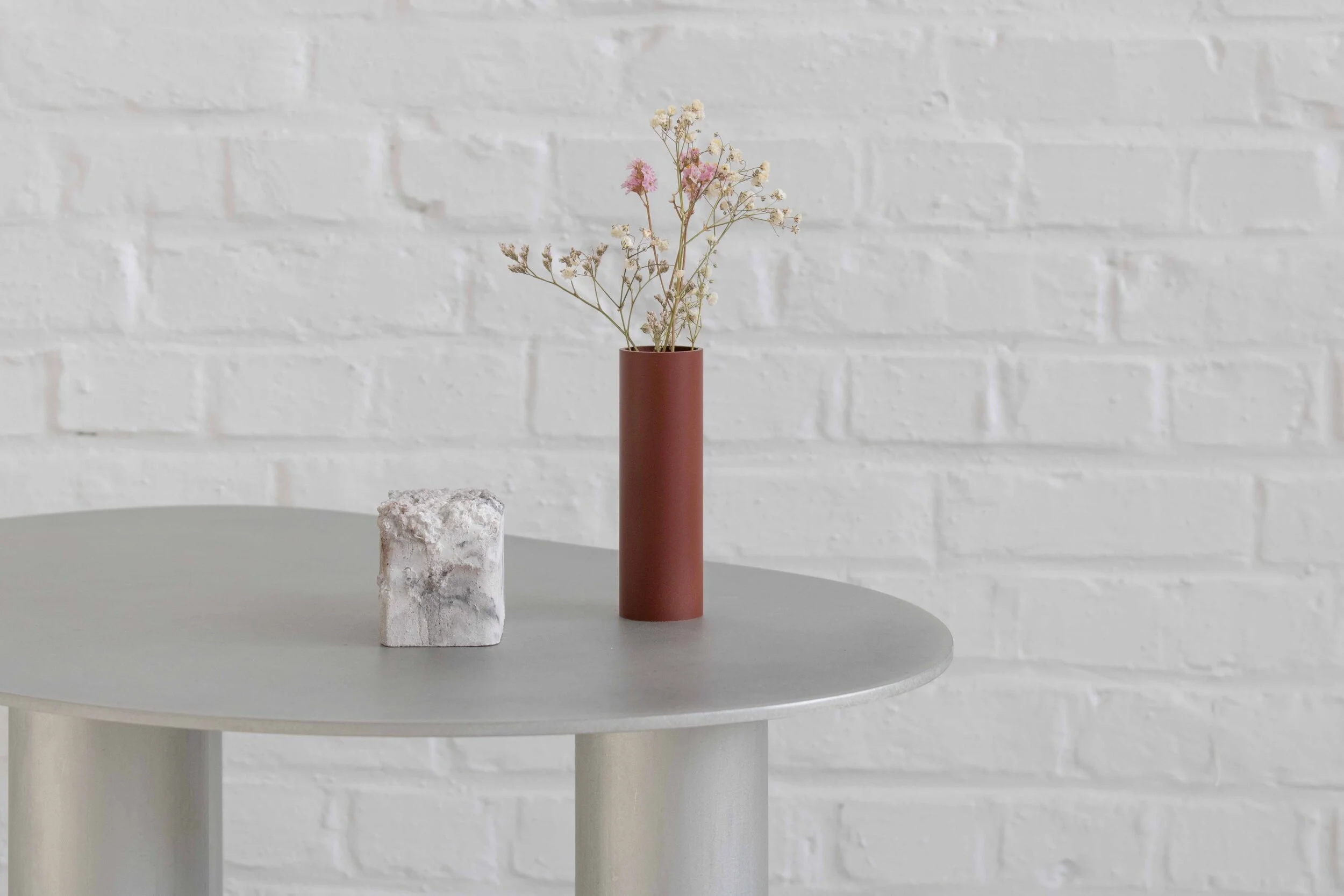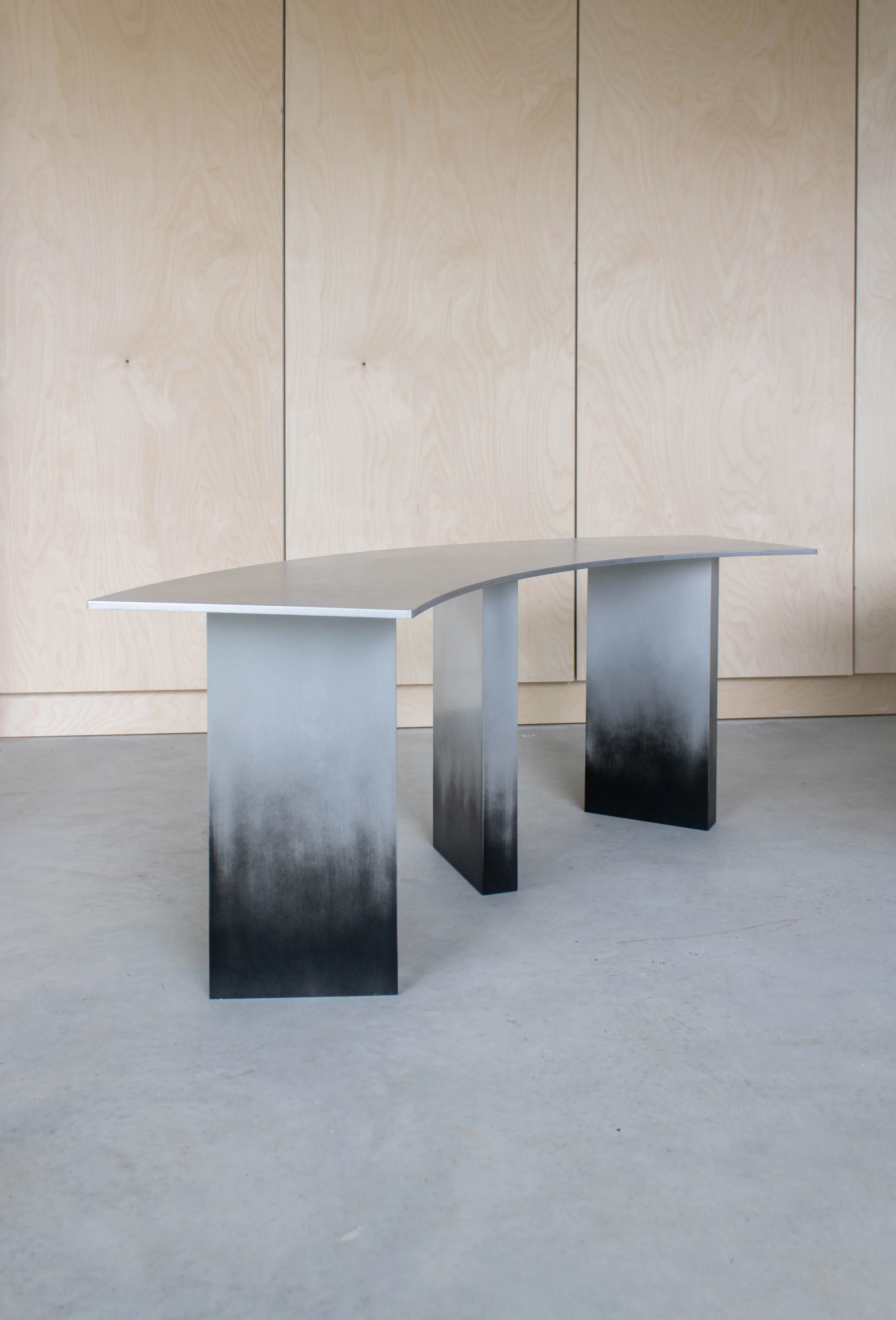 Crafted from aluminum, the table's surface is meticulously finished by hand-sanding, a process that leaves subtle traces of its creation.These imperfections, borne of human touch, add texture and character, celebrating the material's raw beauty while enhancing the table's sculptural allure.