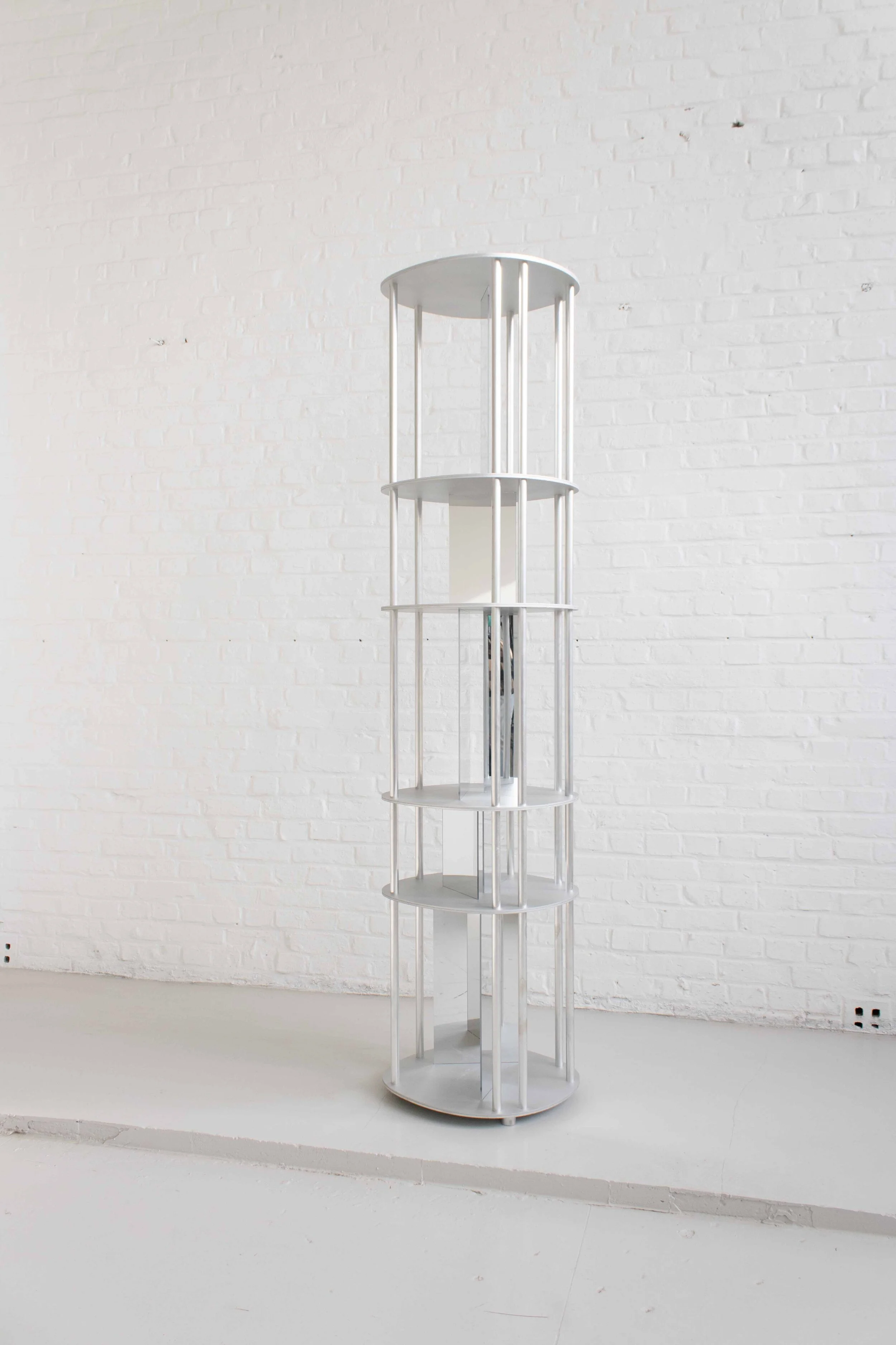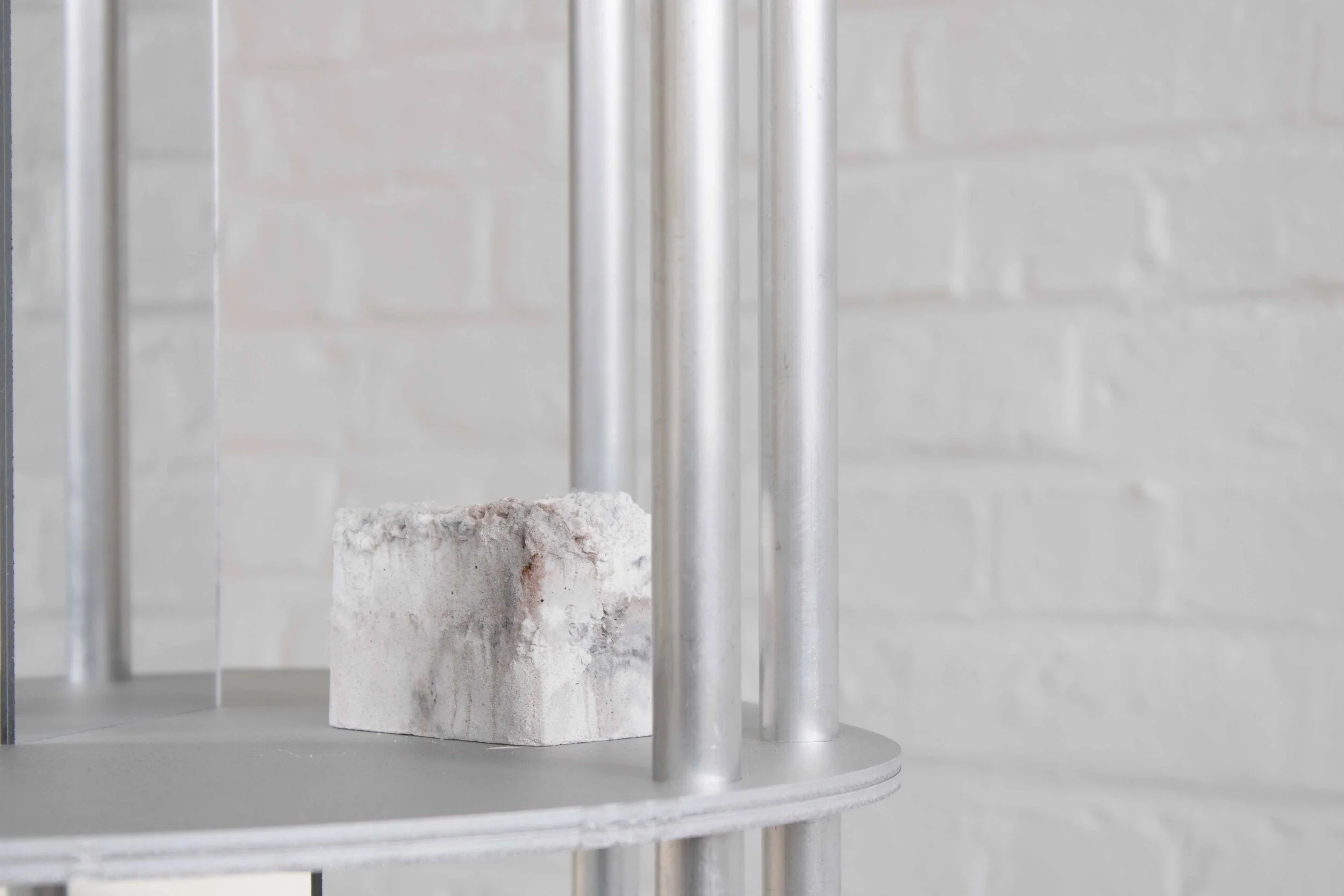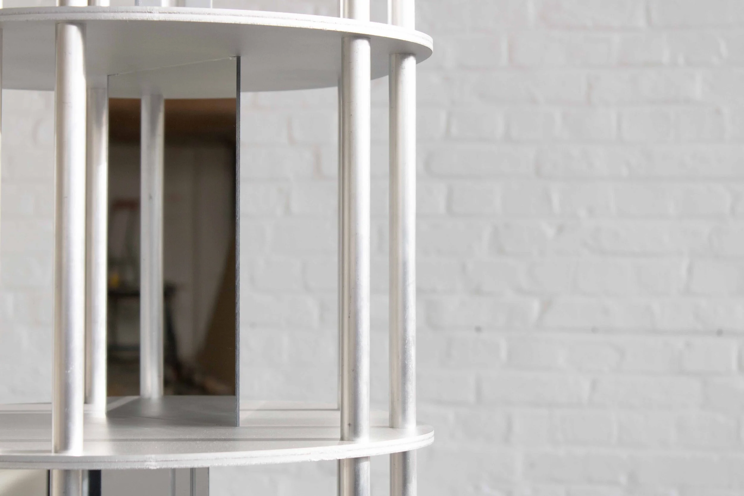 Irregular shapes and element placement form the base of the Reflektor rack. The shelves of the object are characterized by the placement of mirrors at varying angles. The mirrors reflect the objects that are on display on the rack. The piece plays with the optical illusion of real objects and reflections or ‘virtual’ depictions of the objects. As the spectator walks around the tower, reflections appear and disappear, making the viewer question what is real and what is not. At some of the levels, this effect is further enhanced by the usage of two mirrors, resulting in multiple reflections. The subdued colour palette of the mirrors and the aluminium allow full attention to the objects placed on the rack.