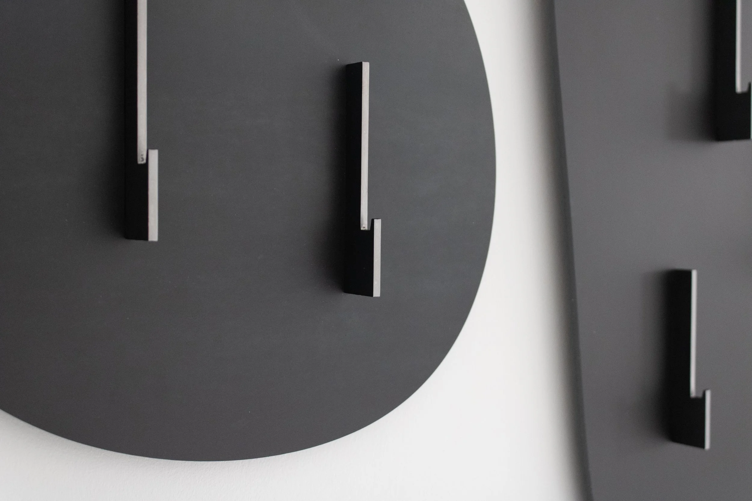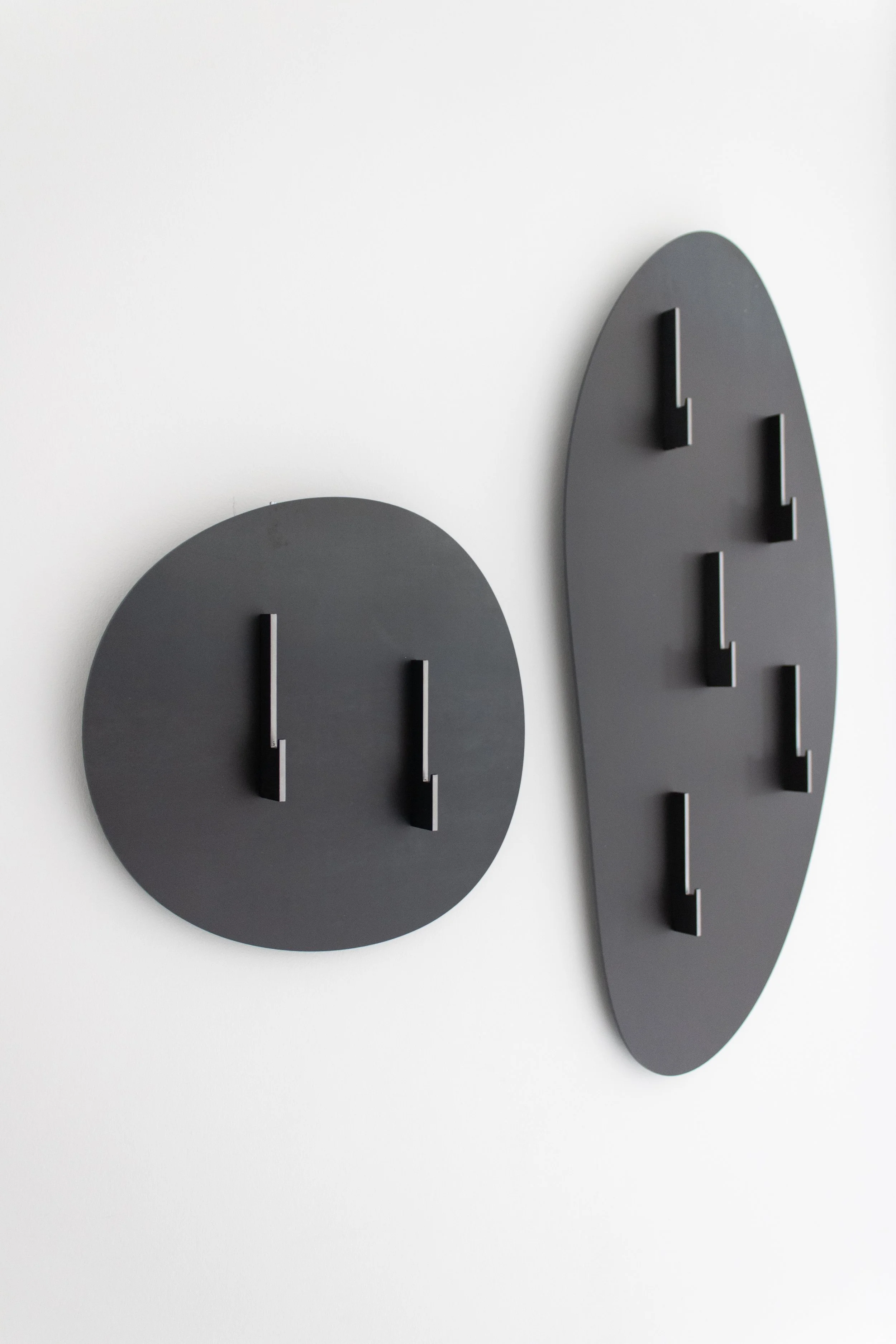 The Cobble coat rack draws inspiration from the shape of cobble stones. Both shape and color are derived from this inspiration source. In the studio’s typical approach of exposing traces of material manufacturing, the ‘defects’ in the hot rolled steel serve as surrogates for the cobble stones natural texture. The piece is highly functional, yet when not in use, it enhances any space as sculptural element on the wall.