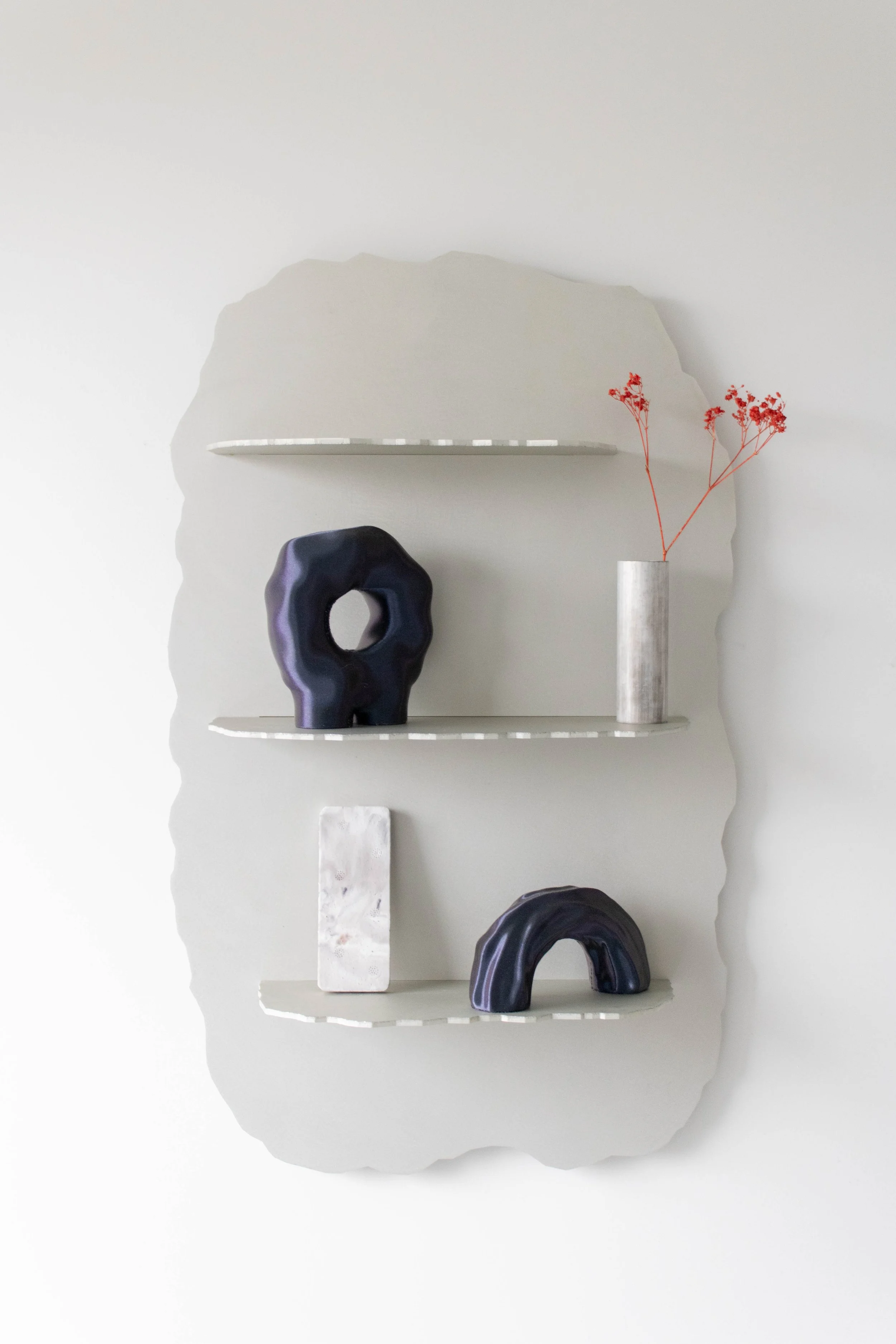 The disrupt shelves are machined from aluminium sheets.The jagged edges suggest a natural origin, which juxtaposes with the industrial nature of the material.