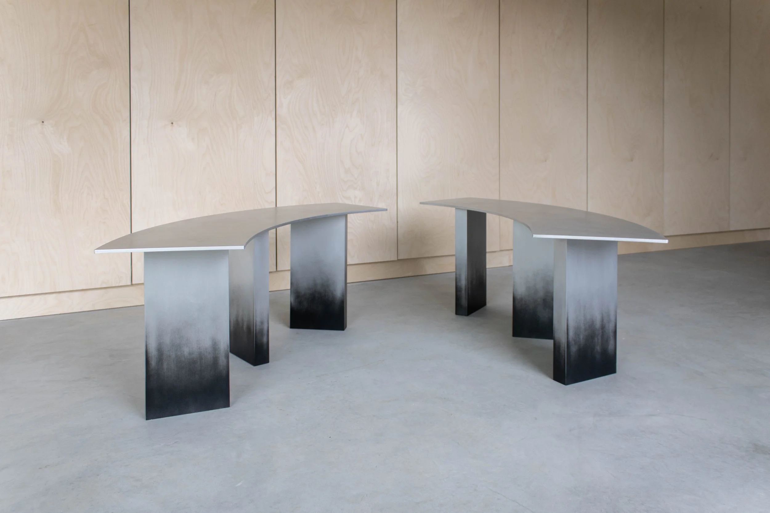 The Arc table's seemingly randomly placed curved table legs create a play of light, shadow and depth. The alternating convex and concave surfaces imbue the piece with a sense of fluid dynamism, transforming its appearance with every shift in light or change in perspective.This ever-evolving presence invites the observer to engage with it anew, discovering different nuances from each angle.