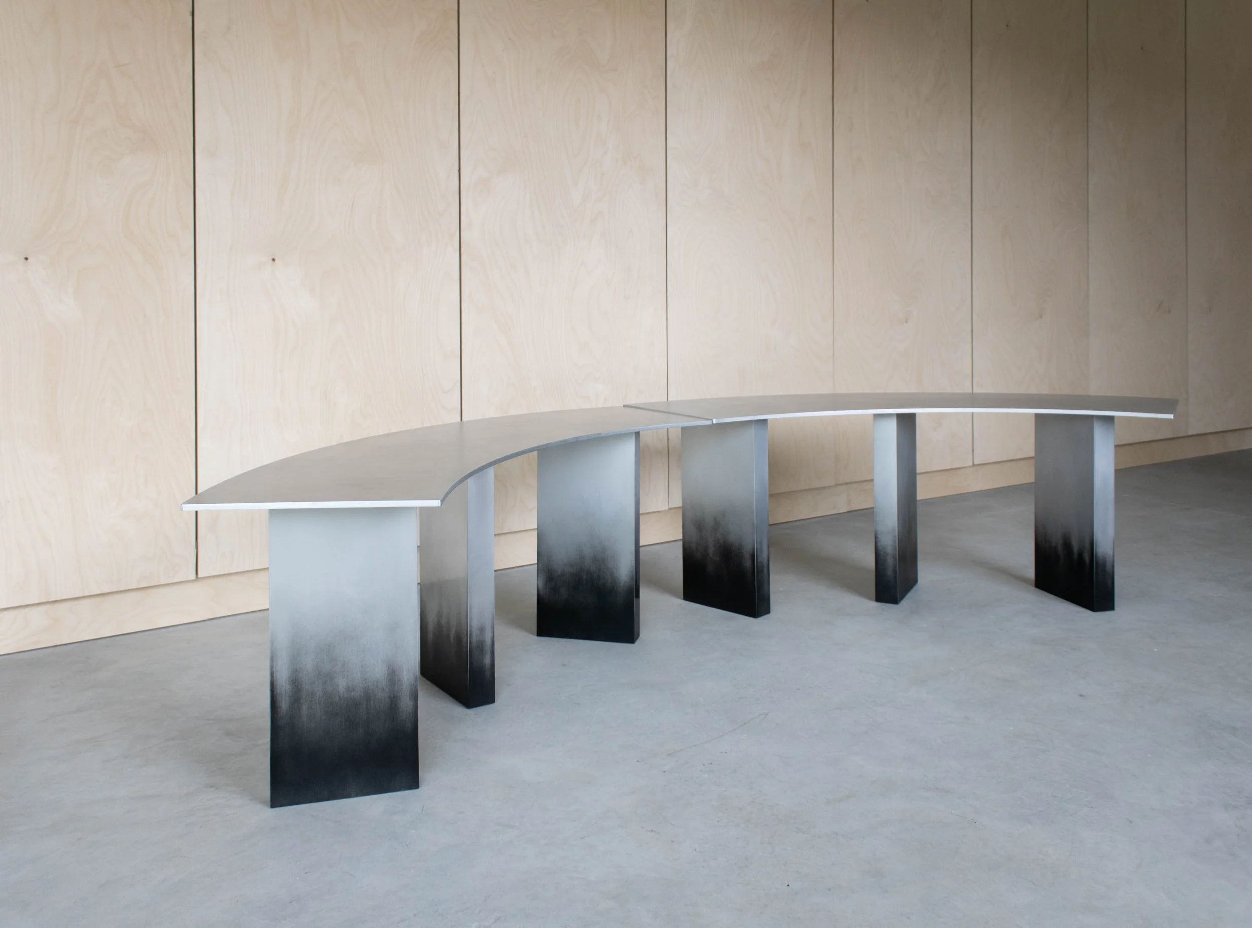 Henge takes inspiration from the ancient circular stone structures, of which the iconic ‘Stonehenge’ is the most famous one.The Henge bench translates these cues into a curved seat supported by 3 columns, placed at irregular angles. This imperfection and the weathered black gradient finish allude to the impermanence of matter over time.