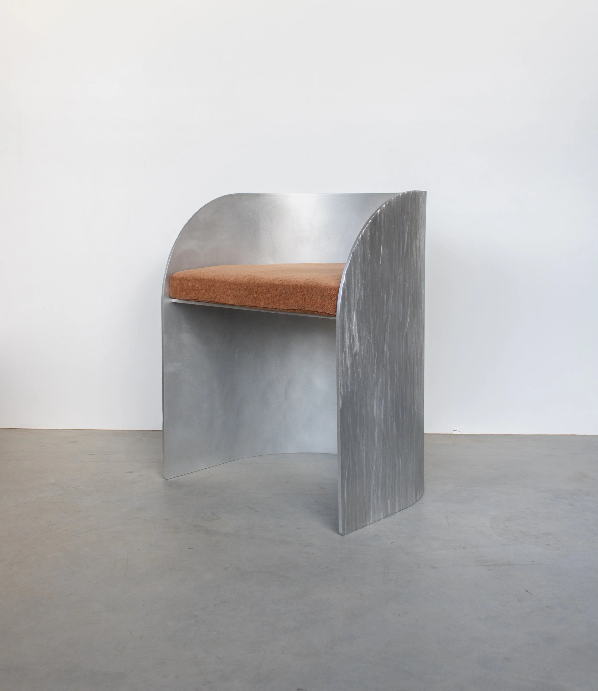 Against this sculpted metal, the upholstered seat introduces softness, its color and surface set apart from the raw body beneath. Together, these elements form a quiet dialogue: hardness and softness, uniformity and variation, structure and touch. The chair becomes less an object of utility than a composition in material and form, poised between the mechanical and the organic.